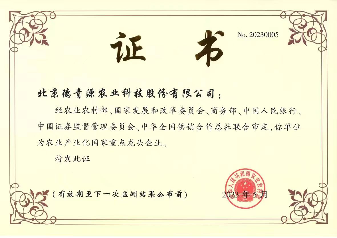 近日,经农业农村部、国家发展和改革委员会、商务部、中国人民银行、中国证券监督管理委员会、中华全国供销合作总社联合审定,北京开云在线登录官网_开云(中国)农业科技股份有限公司再次被认定为农业产业化国家重点龙头企业。这是自2007年起,开云在线登录官网_开云(中国)第8次获得此项殊荣。